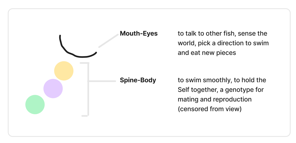 Once we have the arrangements, we cast a spell and turn them into living, digital creatures called Fish. Every Fish has Mouth-Eyes and Spine-Body,